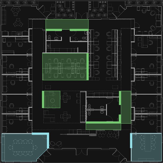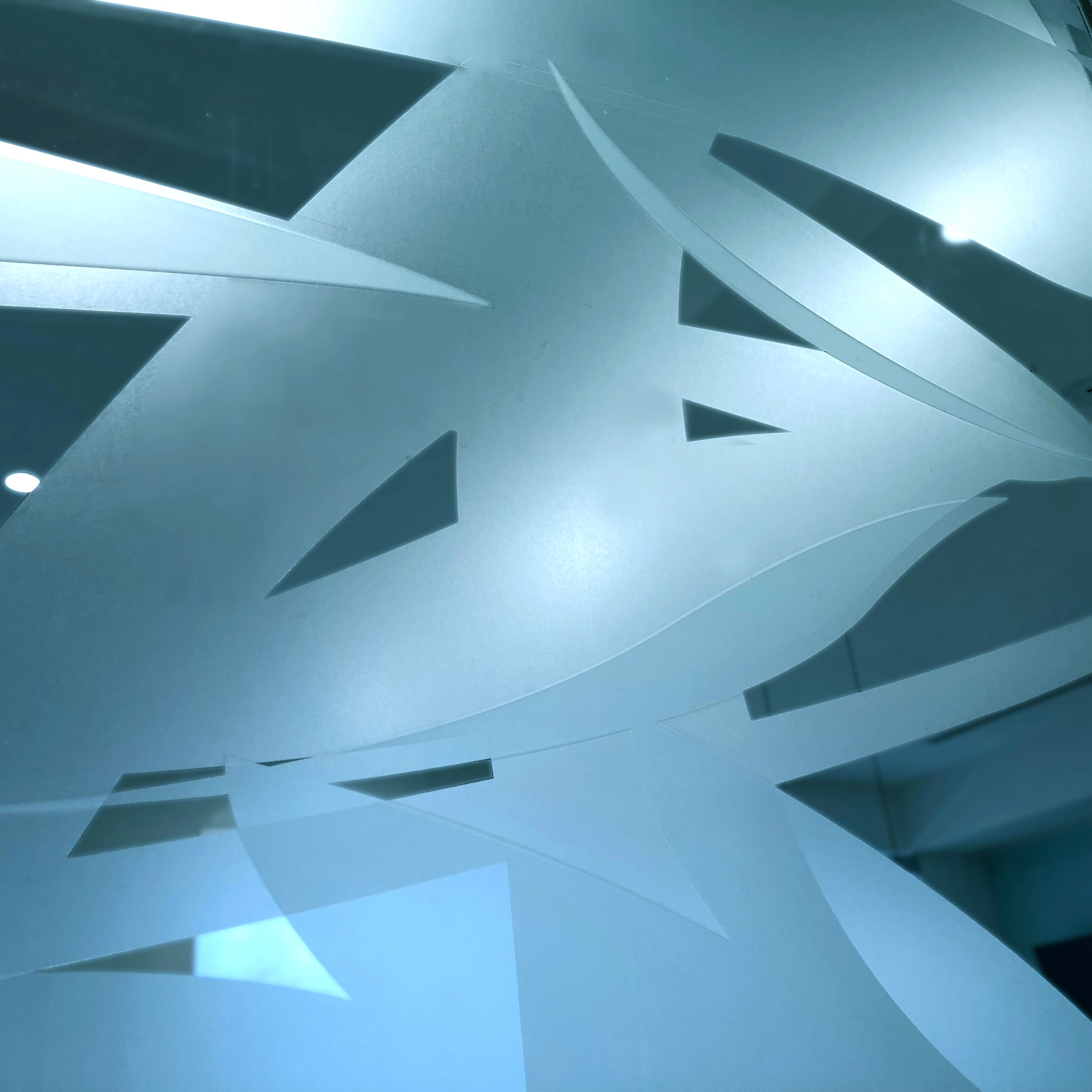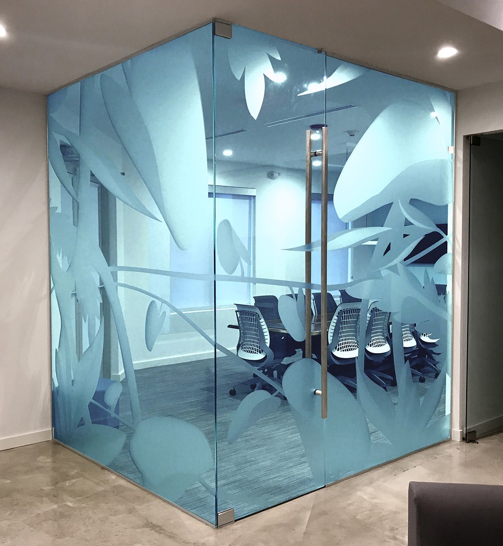 The floorplan connects one environment to the next, creating an immersive experience in full color graphics and frosted glass panels.