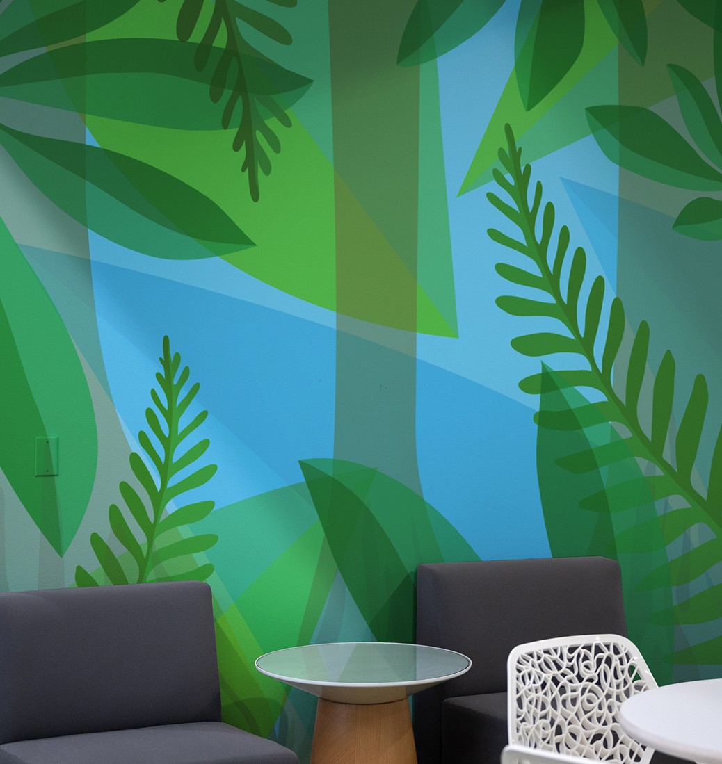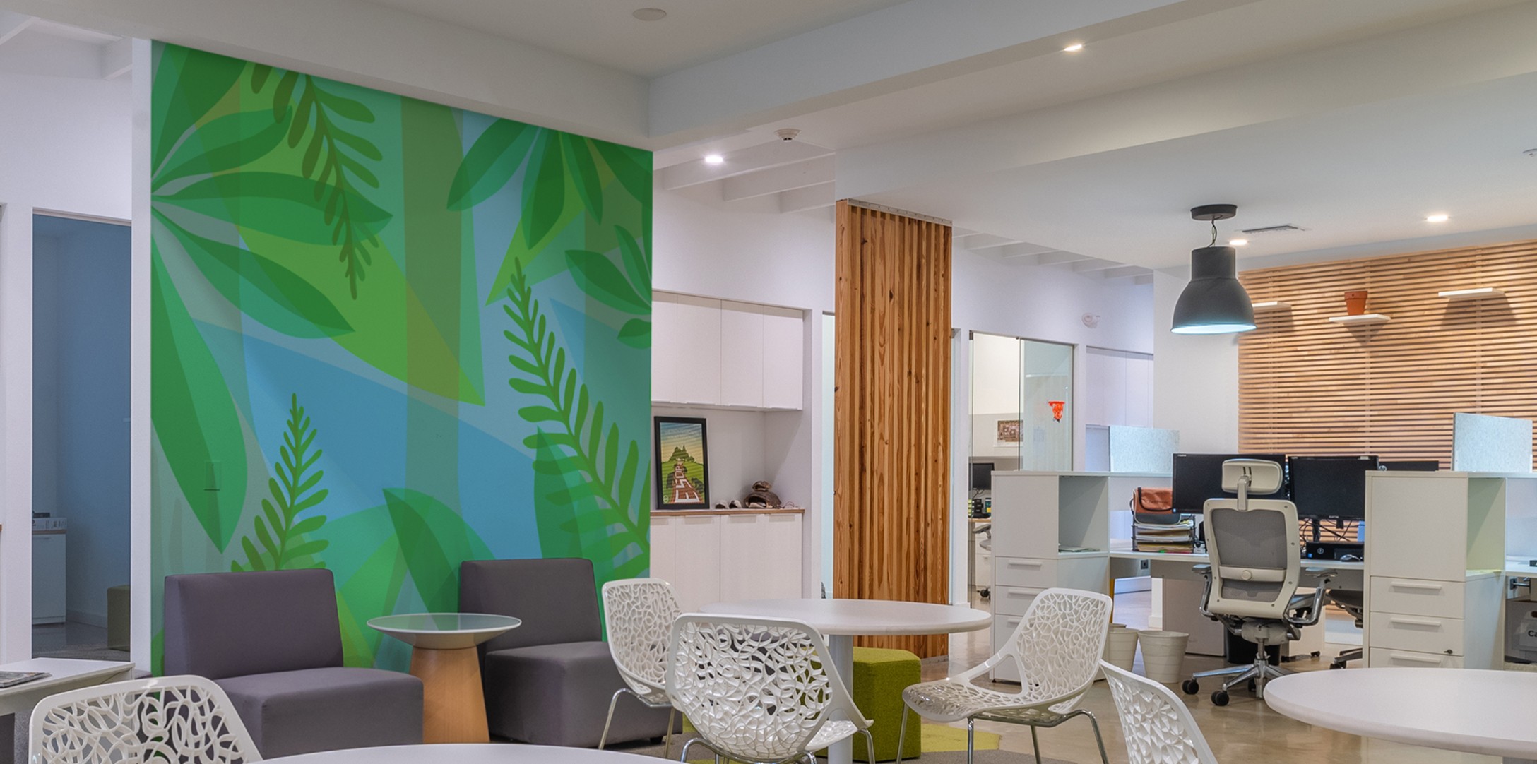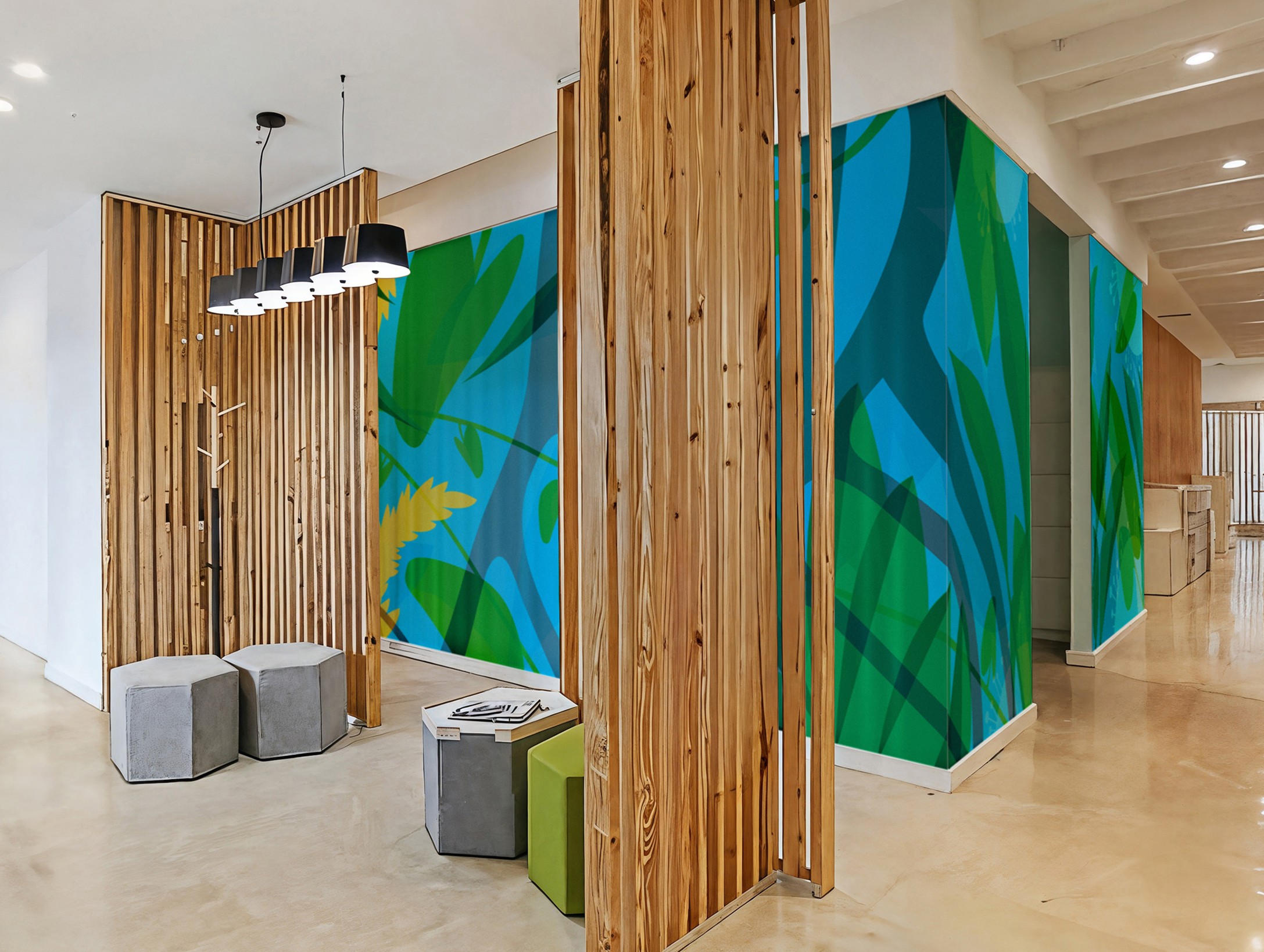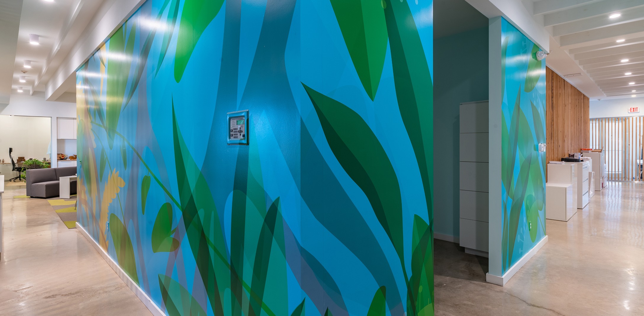Floor to ceiling, wall to wall graphics depicting natural environments transport both team members and visitors to the habitats EarthBalance serves. With a walkaround experience in the office, people can stay immersed in the beauty of nature. The illustrative style is expressive, emotional, and contemporary, aligning with the company’s energetic and positive culture.