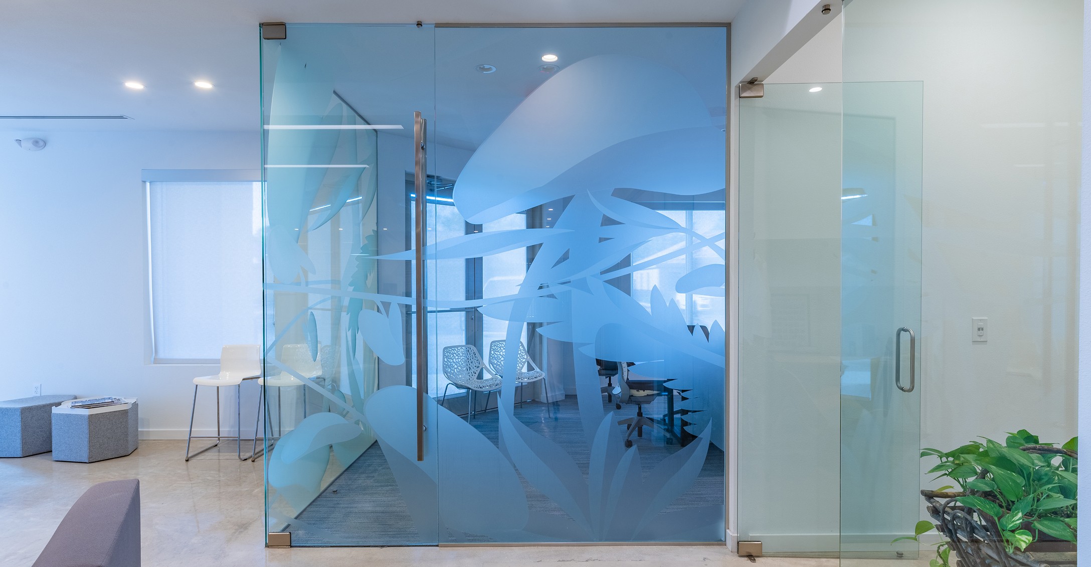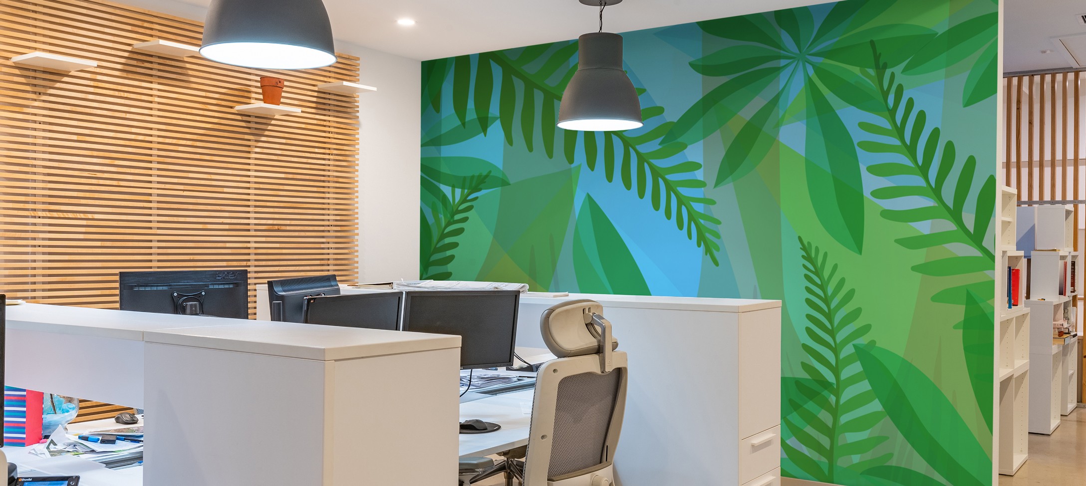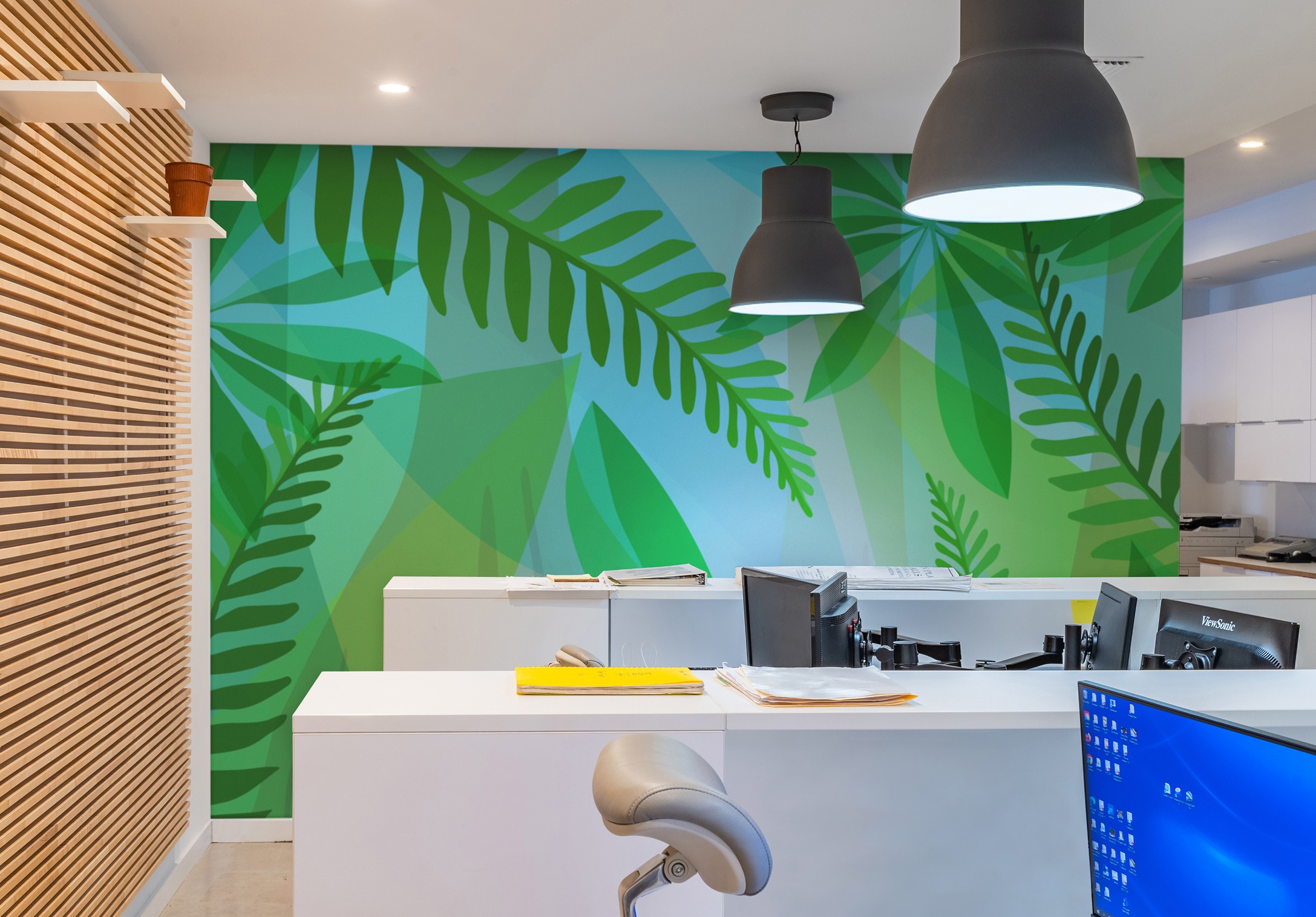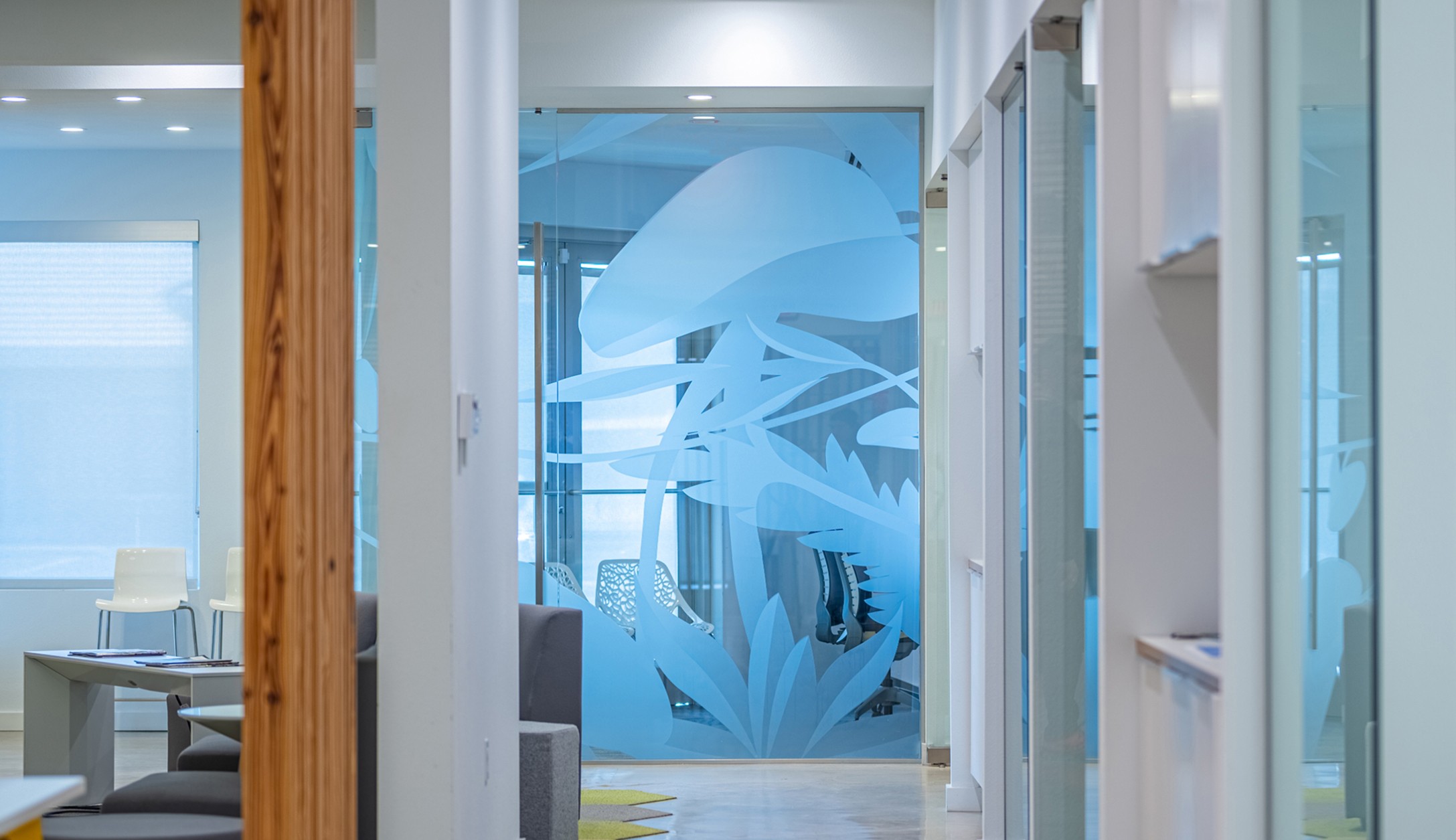 Floor to ceiling, wall to wall graphics depicting natural environments transport both team members and visitors to the habitats EarthBalance serves. With a walkaround experience in the office, people can stay immersed in the beauty of nature. The illustrative style is expressive, emotional, and contemporary, aligning with the company’s energetic and positive culture.