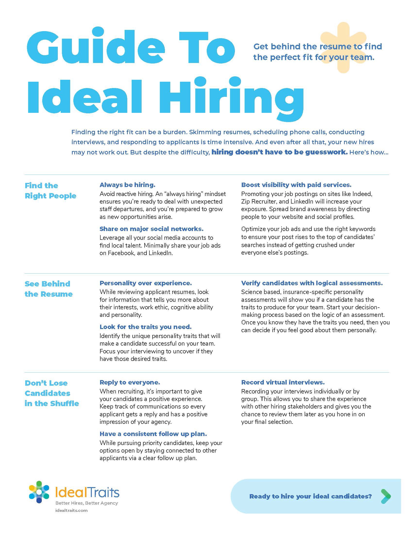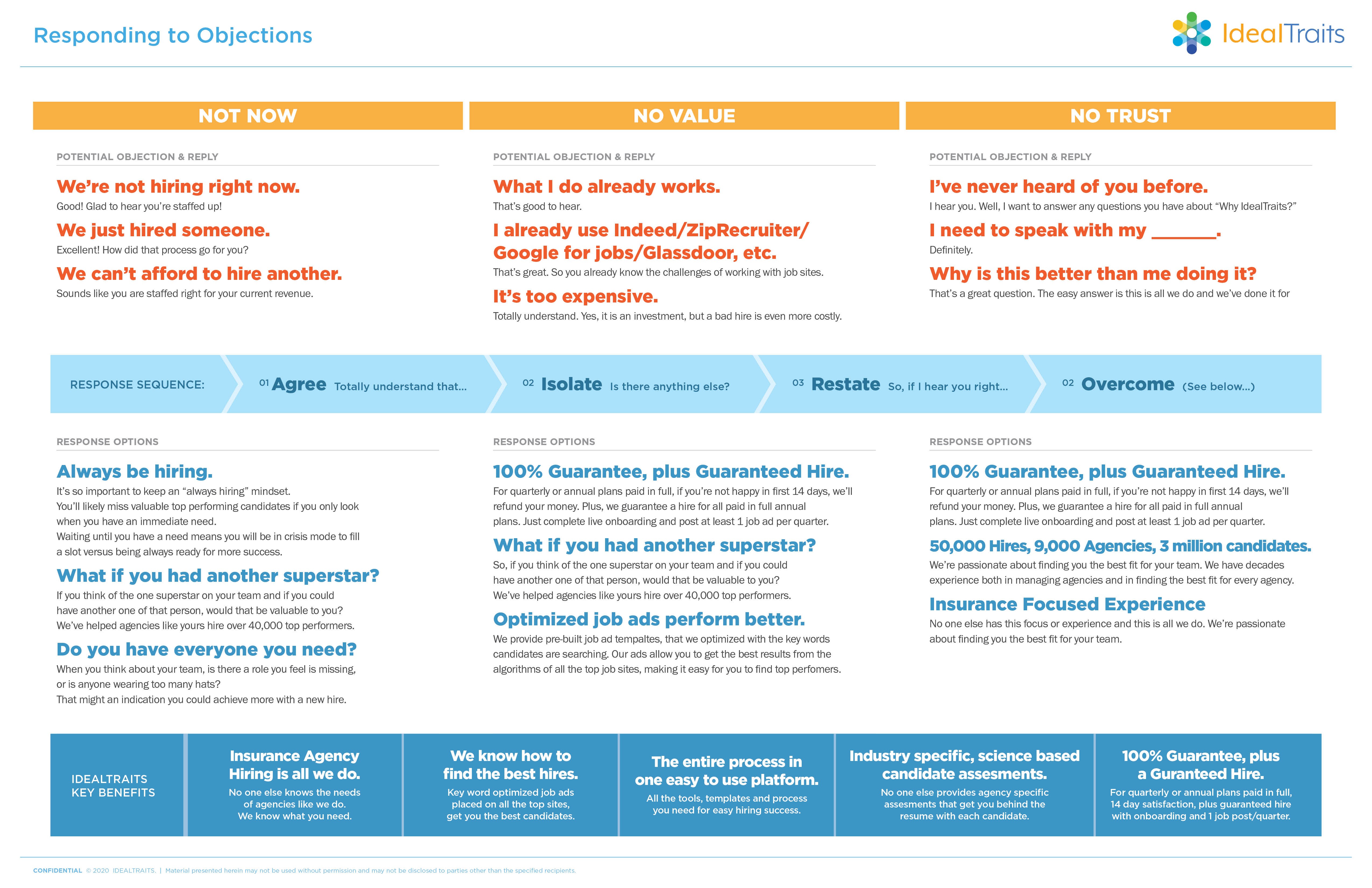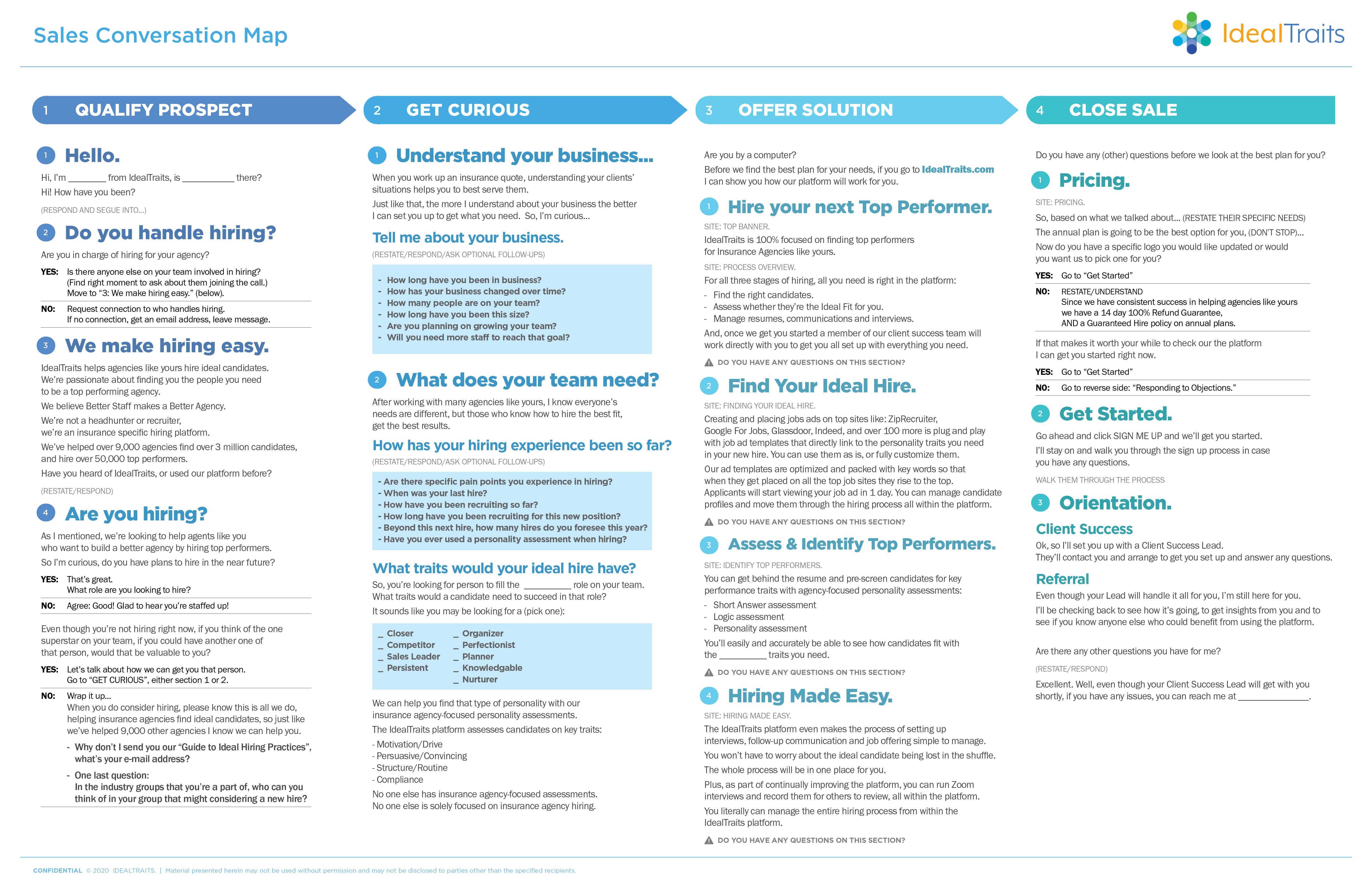 The front is a conversation map detailing a series of questions and answers for their calls. The back covers different objections and responses that point to the benefits of Ideal Traits.
