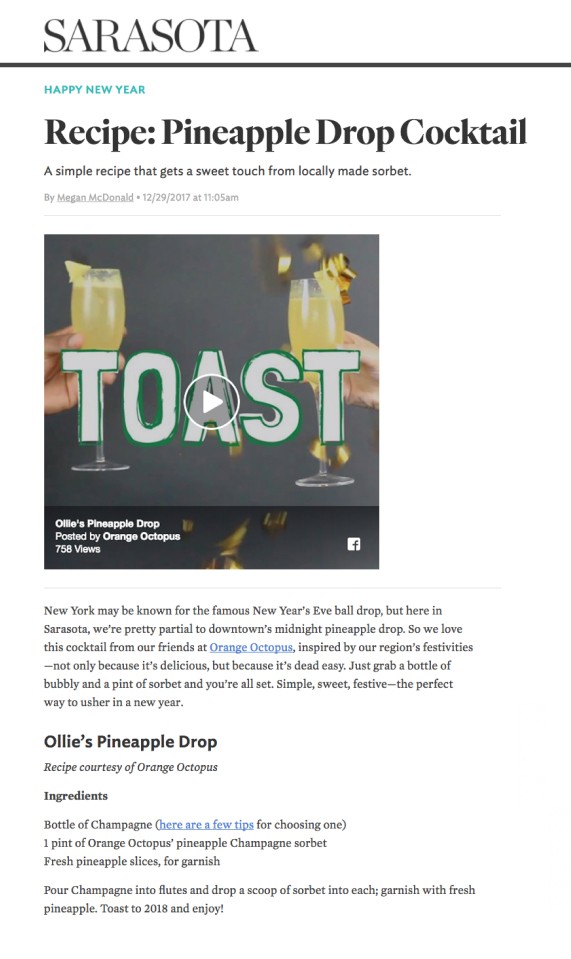 We created a matching cocktail, the Pineapple Drop, served in a champagne flute, which was unique, delicious, and Orange Octopus approved. After designing a social campaign for the special, we took the treat to local magazines where it was featured as a tasty way to celebrate the new year.